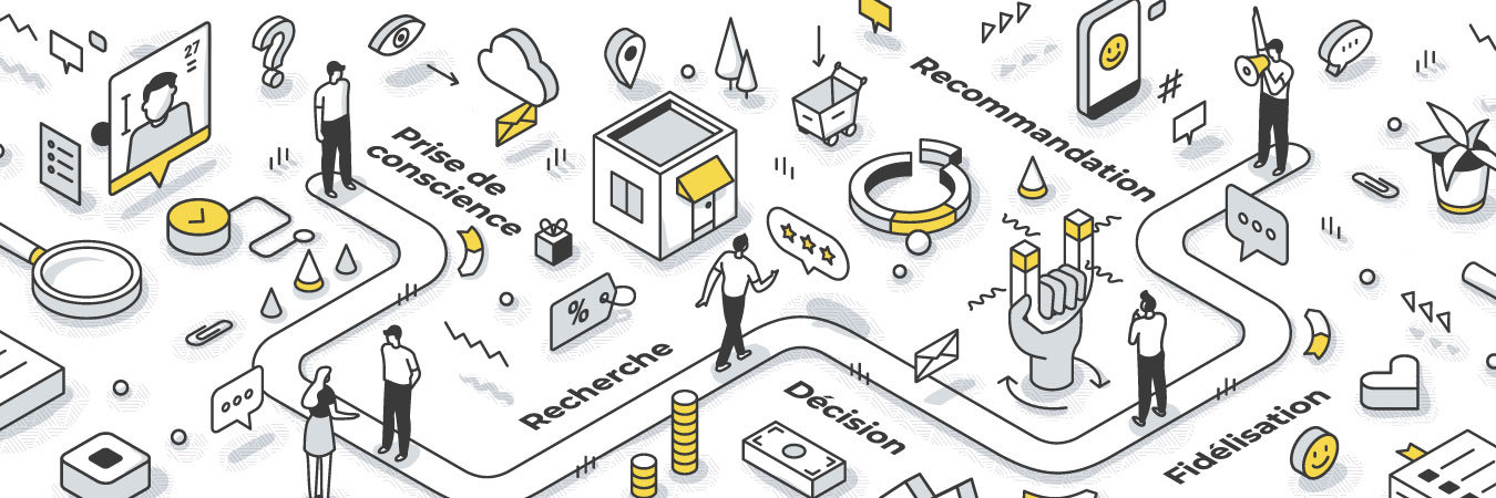 Bien souvent, ce parcours commence avant la phase de décision d’achat, avec la prise de conscience du besoin, la collecte d’information, la sélection des produits et/ou services jusqu’à l’achat, pour se poursuivre ensuite par les services post vente et la phase de fidélisation.